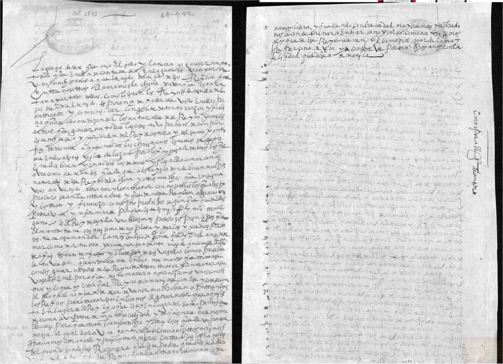 «La graçia de Dios que crio el cielo y la tierra y govierna todo lo que en ella se contiene sea en la guarda y amparo de v.m. y muchos otros a que he tenido notiçia de esos reynos que enttre nosotros llamamos la China y a los que estava tan apartado dellos como lo estan los reynos de Castilla de esos siempre e tenido esperanza de poderme ver en ellos para ttratar y comunicar con gente de tanta rrazon y periçia quanto me dizen ser los naturales dese reyno y ansi este Dios que govierna todas las cosas tuvo por bien se cumplir este my deseo y por orden del Rey de Castilla y del Sumo Pontifice de Roma a quien todos los cristianos estamos sujetos me enbio a estas yslas de Luzon por obyspo y pastor de todos los que en ella biven y en todas las demas yslas a ela comarcanas avra como siete meses que llegue a esta ysla donde biven muchos naturales de ese Reyno de la China y ottros muchos que en sus navios an venido a ttratar y conttratar con nosotros los quales procuro sean bien tratados y que de nadie reçiban agravios y los ttrato y favorezco como propios hijos según que que de ellos podra v.m. ynformarse porque este es mi officio y no ottro alguno. Es el Rey de Castilla uno de los mas poderosos principes que el mundo tiene riquisimo de oro plata y perlas y piedras preciosas tiene asu mandar la mas belicosa gente que ay en el ansi por mar como por tierra y contener su asiento más de çinco mill leguas de aquí. Es tan temido y obedeçido de sus vasallos como si presente le tuviesen. Quando aca me envio me mando que ttratase con los governadores de ese Reyno dexasen ttratar y conttratar a sus vasallos en el para que desta manera nos conozcamos unos con ottros y lo que ay en aquel Reyno se comunicase con ese y lo dege con el de lo qual no puede dexar de venir mucho bien a entrambos los Reynos: para ttratar esto enbiamos el governador que aquy esta en lugar de el Rey . E yo que estoy en lugar del Sumo Pontifice de Roma a un padre de mucha calydad y de quien aca hazemos mucho caso para que ttrate lo arriba dicho y otras cosas que lleva por memorya al qual dara v.m. tanto credito como a nosotros mismos que fueramos a ttratarlo y pues los mensajeros enttre todas las naçiones del mundo son libres razon sera que este padre que lo hes seades bien y de todos los de ese Reyno tanbien ttratado como aca es peramos lo sera y que siendo con brevedad muy bien despachado nos le an de tornar a enviar sano y salvo como aca hazemos a los que de ese Reyno vienen. El sumo Dios guarde la muy Ilustre persona de v.m. y le conserve por muchos años en la feliçidad que desea de Manila.»