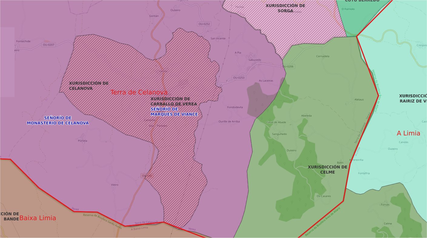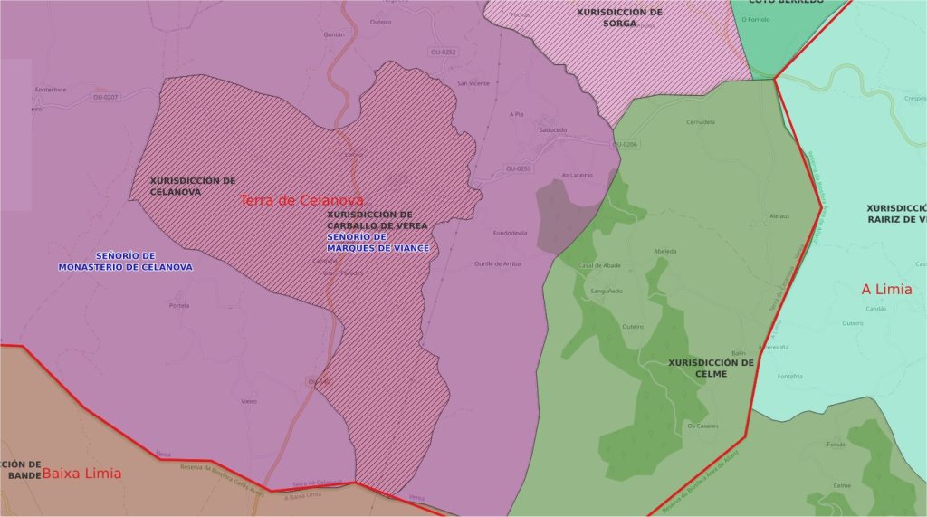 - Facendo zoom directamente poderemos visualizar a parte do territorio que máis nos interese, e obteremos información espacial das distintas capas superpostas (son transparentes). Por exemplo, se facemos zoom na comarca de Terra de Celanova (as comarcas distínguense por ter o contorno e a etiqueta de cor vermella), aparécennos tres xurisdicións (Celanova, Carballo de Verea e Celme) e dous señoríos (Mosteiro de Celanova e Marqués de Viance). Se seguimos facendo zoom chegaremos hasta os lugares de As Cavadas, Outeiro, Sanguñedo, etc. como pertencentes á mesma xurisdicción de Celme: