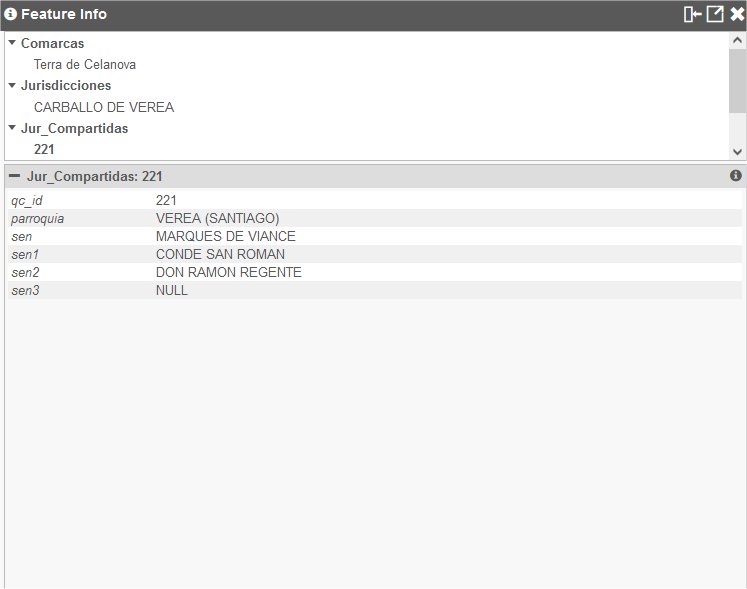 - No caso das xurisdicións con dous ou máis señoríos (señoríos compartidos que aparecen no mapa co raiado ///) podemos obter máis información facendo click na propia xurisdición, por exemplo de Carballo de Verea despregarásenos unha ventana cos nomes dos señores xurisdicionais que compartían dita xurisdición: