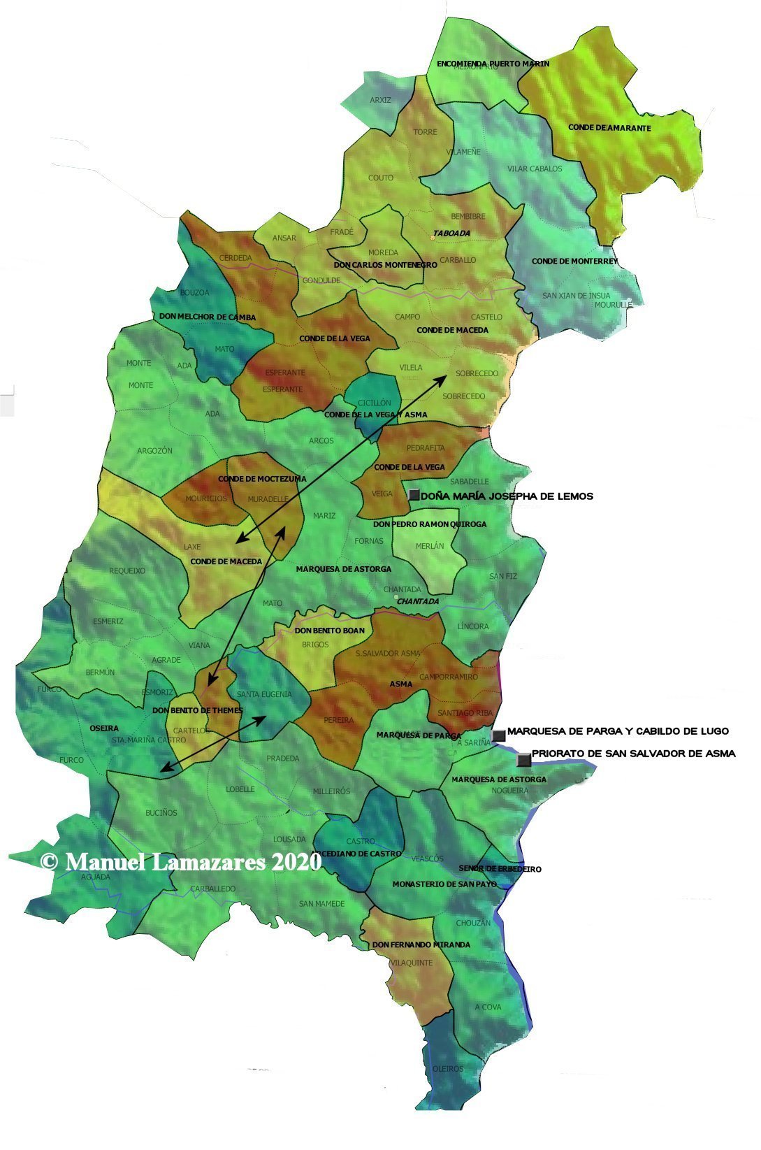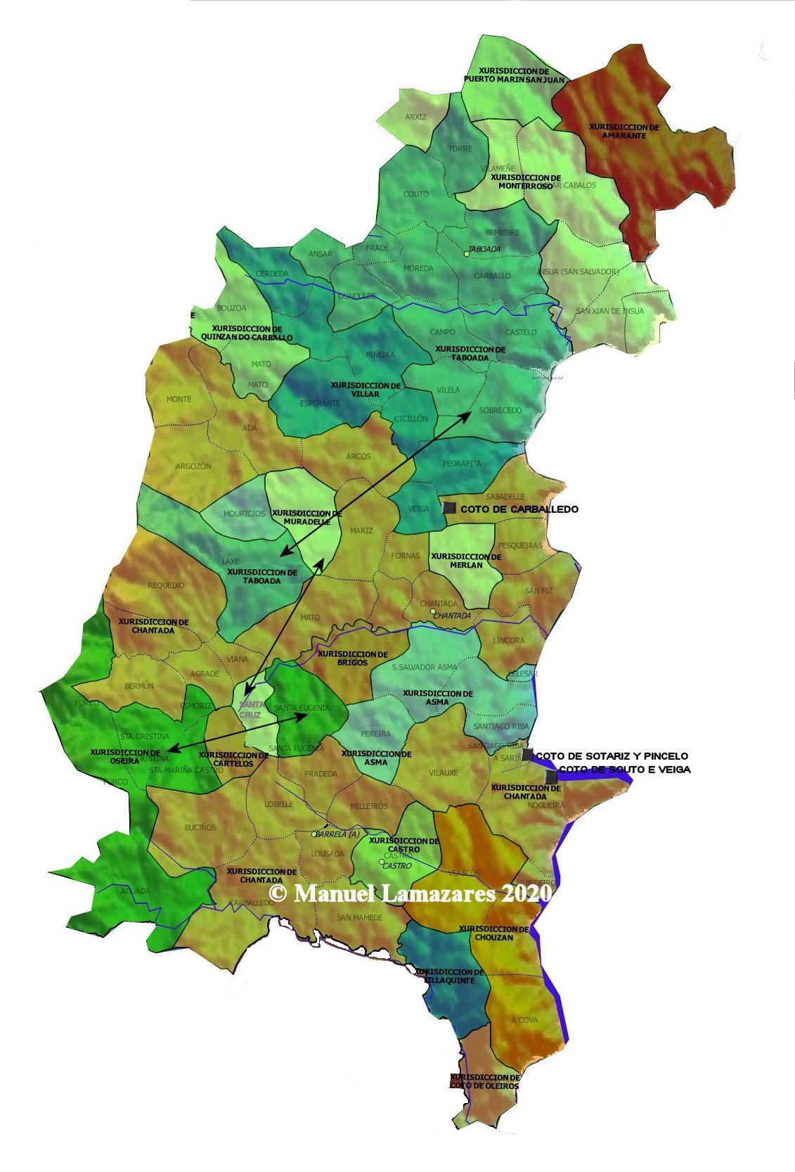 Concello de Taboada.- A parte Norte do actual concello de Taboada comprendía as xurisdiccións de Amarante (freguesía de Xián) e de Monterroso (Insua, Arxiz, Vilameñe, Vilar de Cabalos, Meixonfío, Mourulle e San Xian de Insua); a parte central da propia Xurisdicción de Taboada pertencía ao conde de Maceda e a Don Carlos Montenegro -freguesía de Moreda-; e finalmente a parte sur que comprendía a xurisdicción de Villar, dominio do conde de la Vega, ainda que a freguesía de Cicillón estaba compartaida co mosteiro de San Salvador de Asma- e a xurisdicción de Quizán de Carballo, que era do dominio de Don Melchor de Camba -coa excepción da parte Norte do núcleo de Susá que era propia de Don Antonio Quiroga (mapa 4).