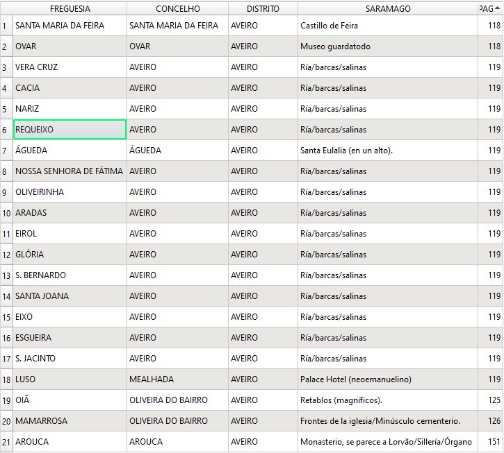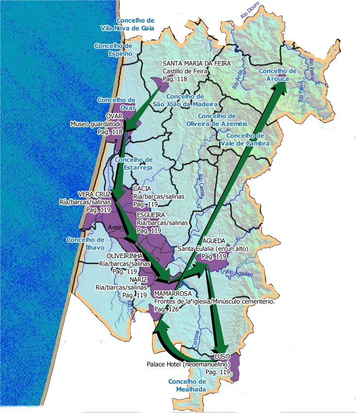 Saramago chega ao distrito de Aveiro procedente do Porto. A primeira poboación que visita é Feira, co seu famoso castelo “con chapiteles cónicos…que lle dan un aire de casa apalaciada” ver. En Ovar visita o seu museo “que non é un museo, é un guardalodo” pero valora “o amor con que foron reunidos todos os obxectos” ver. Desde Ovar desprázase a Furadouro, “onde hai unha praia cun areal sen fin” ver. Máis abaixo está a ría de Aveiro, corenta quilómetros de costa por vinte cara ao interior. Atravesa Saramago a rexión da Murtosa, onde as casas teñen un aire palaciego que considera obra dos adornos de barro vermello, pináculos, chapiteles e volutas que se dispoñen ao longo dos tellados ver. Aveiro no século X era un minúsculo poboado de pescadores pero xa entón explotábanse as salinas e as algas. Visita o museo e sente sorprendido polo gran número de pezas aínda que lle chama a atención o Cristo crucificado pola súa “vulgar anatomía” ver. Do claustro encomia os seus bancos cubertos de azulexos ver. En Oiã foron reunidos uns magníficos retablos traídos do convento de Santa Ana de Coimbra ver. En Mamarrosa contemplou o frontis da igrexa e visita o minúsculo cemiterio que está á beira da igrexa.