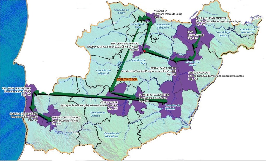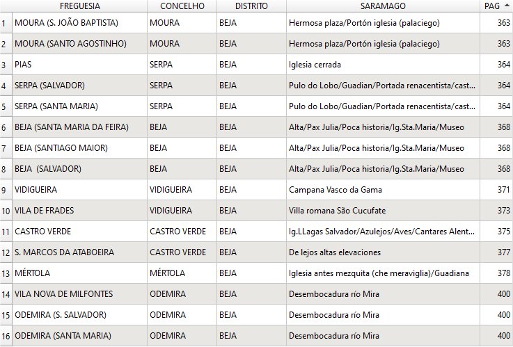 Comeza o percorrido en Moura admirando a súa fermosa praza e o portal trilobulado da igrexa parroquial ver. Dorme preto de Serpa onde “non recolleu gran cousa” salvo o portal renacentista da antiga leprosería e as murallas do castelo. De Serpa parte para o «Pulo do Lobo» ver, que se chama así a unha rápida corrente de auga do Guadiana que se precipita entre rocas. Beja está edificada nun alto e toda a cidade dá a impresión de descoido urbanístico. Saramago admira sen embargantes a torre da homenaxe do seu castelo “grande e impoñente”, que supera en altura á de Estremoz ver. Visita o museo de Beja e sorpréndelle pola “inesperadamente boa pintura”, e considera o seu “San Vicente” de obra maestra. Diríxese ao Norte cara a Vidigueira, orixe de Vasco da Gama, onde ainda se conservan as campanas que él mandou fundir. En Castro Verde visita a súa igrexa con inxenuos cadros de escenas guerreiras e un bo panel de azulexos. Xa en Mértola coincide cuns italianos na visita á súa igrexa, antiga mesquita, “Che meraviglia” ver. O río Vascão marca a divisoria entre o Alentejo e o Algarve, próxima etapa da súa viaxe por Portugal.