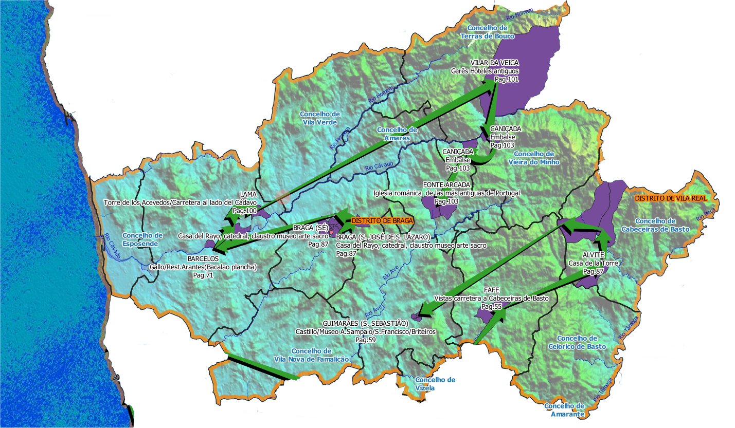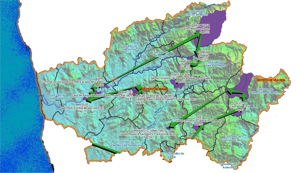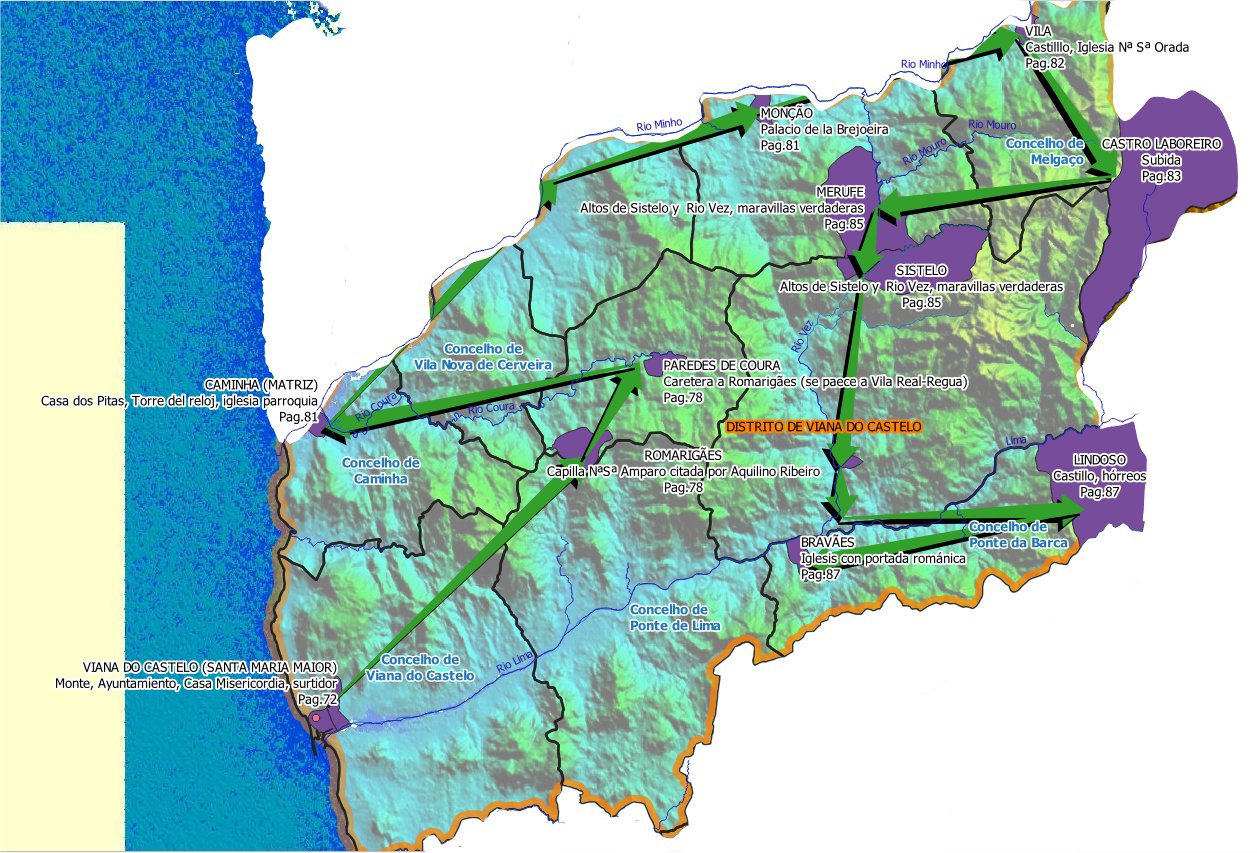 Desde o distrito de Vila Real Saramago atravesa a Serra do Marão ver ata chegar a Amarante, onde fai un alto no camiño para dirixirse despois por Marco de Canaveses e Guimarães (ver distritos de Porto e Braga) ata Viana do Castelo. Alí alóxase no Monte de Santa Luzia e visita os principais monumentos da cidade “pródiga en portas e xanelas manuelinas”, en cuxo museo atópase “a máis completa e rica colección de cerámica portuguesa». Despois de tomar a estrada por Paredes de Coura e Romarigães (que lle lembra a que vai de Vila Real a Peso dá Régua), o viaxeiro atópase xa en Monçao, onde visita o Palacio de Brejoeira ver. Califica aos entornos de Sistelo e Merufe ver de «maravillas verdadeiras». En Giela, preto dos Arcos Arcos de Valdevez atopa o viaxeiro «Un dos máis belos exemplares deste tipo de construción existentes no país» ver. En Lindoso admira a disposicion dos hórreos que parecen unha cidade ver e en Bravães a súa igrexa románica ver, desde onde se dirixe a Braga.