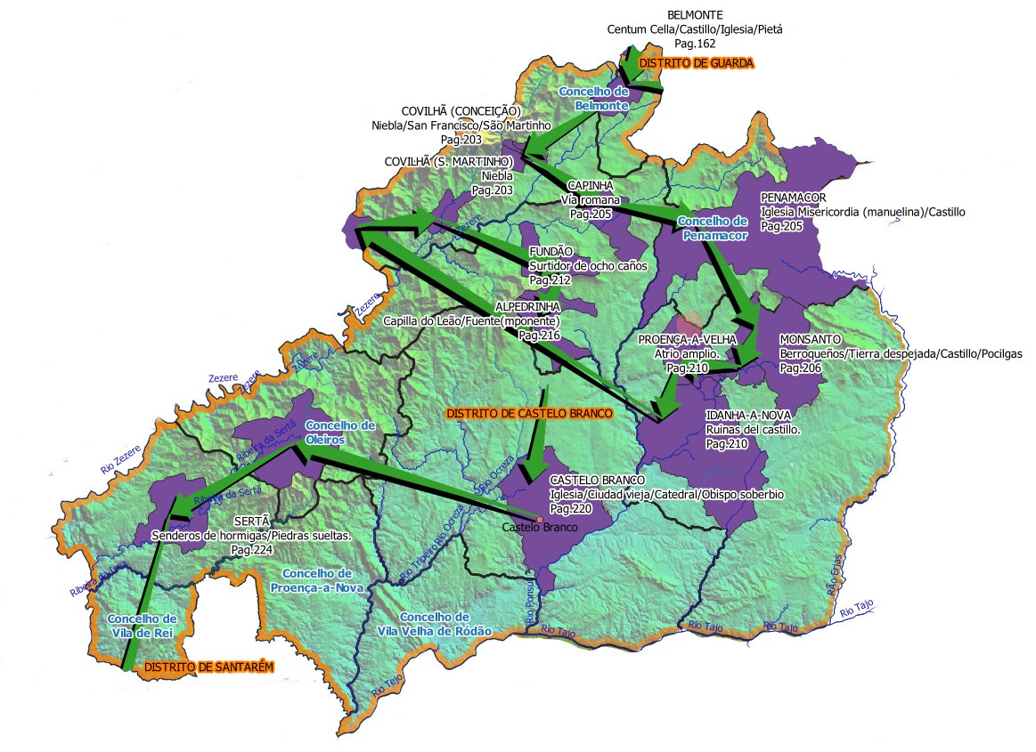 O viaxeiro sae da Guarda cara ao Sur paralelo ao río de Gaia e entra en Belmonte, terra do descubridor de Brasil Álvarez Cabral. Eloxia o enigmático edificio “Centum Cellas”, que ninguén sabe a que se dedicaba, e a súa igrexa parroquial coa “Pietà” ver. Desprázase a Covilhã e de alí a Capinha coa súa calzada romana. En Penamacor visita a súa igrexa manuelina e o castelo. Por terras despexadas chega a Monsanto, coas súas pocilgas no castelo. En Idanha-a-Velha (a antiga Egitânia) visita a basílica paleocristiana en ruínas o que lle produce sensación de abandono. En Idalha-a-Nova presencia tamén as ruínas do castelo e chega a Proença-a-Vella. De alí desprázase a S. Jorge dá Ribeira, onde o soldado José Junior morreu por non descubrir a un compañeiro. En Paul ver admira o insólito teito pintado da igrexa parroquial e describe a abundancia de ouro da aldea de Ourondo e diríxese cara a Donas, coa sua elegante “Casa do Paço” ver. En Alcaide visita a ampla igrexa parroquial, e en Alpedrinha, lugar onde naceu o cardeal do mesmo nome, admira a fonte do rei João V. Conmóvelle Castelo Novo ver, construído na saia dun monte, con ruínas e palacios seiscentistas e a sua “Lagariça” que se usabe para pisar as uvas. Na capital do distrito percorre a cidade vella e a catedral para finalmente por malas estradas chegar a Sertã, onde acaba o viaxe por o distrito de Castelo Branco.