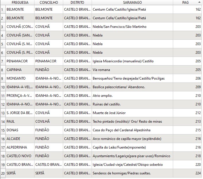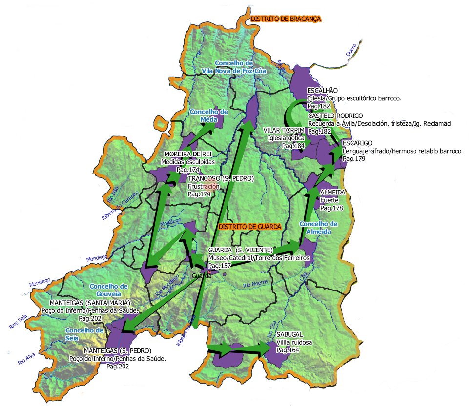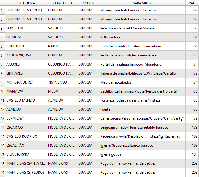 No seu percorrido por Portugal Saramago visita a cidade de Guarda ver, capital do distrito do mismo nome (ver mapa e cadro adxunto), e establece pronta amizade co señor Guerra, camareiro xefe do hotel onde se hospeda, quen lle acompañará na súa visita á sua aldea natal chamada Cidadelhe (o «cu do mundo», segundo a denomína Saramago). En Sortelha ver admira as murallas e o seu carácter medieval. A Sabugal considéraa vila ruidosa. En Aldeia Viçosa (antes chamada Porco) ver visita a igrexa parroquial neoclásica que, segundo as súas palabras, cáusalle asombro. Séguelle Linhares, cunha interesante tribuna de pedra que era onde antigamente reuníase o concello, e Marialba ver co seu castelo e rúas empinadas. En Castelo Mendo visita a fortaleza que rodea a aldea ver e en Almeida o forte ver. En Vermiosa ve as rúas sucias e as persoas escasas. En Escarigo, próxima á fronteira española, sinala a linguaxe cifrada dos seus habitantes para “irrisión dos forasteiros”, pero enxalza o retablo barroco da súa igrexa. En Escalhao destaca o grupo escultórico barroco da igrexa parroquial. Castelo Rodrigo coas súas murallas lémbralle a cidade española de Ávila ver. En Vilar Turpim admira a igrexa gótica e finalmente visita en Mangeigas o chamado Poço do Inferno.