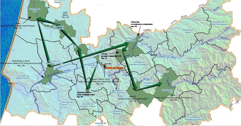 Saramago concibe Coimbra con dúas cabezas e buscaría a Coimbra natural, esquecería a universidade, e empezaría visitando as casas da Couraça de Lisboa ver. Non entra na universidade pero réndese diante do portal manuelino da Capela de San Miguel ver. Recoñece que o museo Machado de Castro posúe a máis rica colección de estuaria medieval de Portugal, pero hai tamén focos do renacemento con obras de Chanterenne e Ruão. Aínda que Saramago “sentese máis profundamente conmovido polas pequenas e rústicas igrexas románicas do norte” non deixa de valorar a Sé Velha como o máis fermoso monumento románico de Portugal ver. Visita a igrexa de Santa Cruz e sorpréndelle ver o sepulcro de Alfonso Henriques cando non facía moito tempo deixárao na porta do castelo de Guimarães. Gústalle o púlpito de pedra de Joao de Ruão e conclúe que a igrexa de Santa Cruz é moi fermosa ver. En Castanhede visita a súa igrexa pero non esquece “un bacallau ao forno que quedará na súa memoria”. En Palheiros de Mira cústalle atopar os “palheiros” sobreviventes. Prodúcelle unha poderosa impresión o castelo de Montemor-ou-Lanuxe e admira a amplitude da igrexa e o retablo renacentista de Santa María de Alcáçova ver. Alármase pola contra da “maneira en que se falta ao respecto a preciosas obras de arte” como a sucede coa igrexa da Misericordia ou o convento de Nossa Senhora dous Anjos ver. Comenta Saramago que o castelo de Lousã é, desde o punto de vista da paisaxe, unha das cousas máis belas de Portugal ver. Finalmente en Góis comenta ao ver a tumba de Luís da Silveira arrodillado que sen duvida tratase dunha obra mestra ver. De Lorvão non viu moito e da serra de Buçaco pensa que é o “reino do vexetal” e retírase a descansar xa de noite a Oliveira de Azeméis.