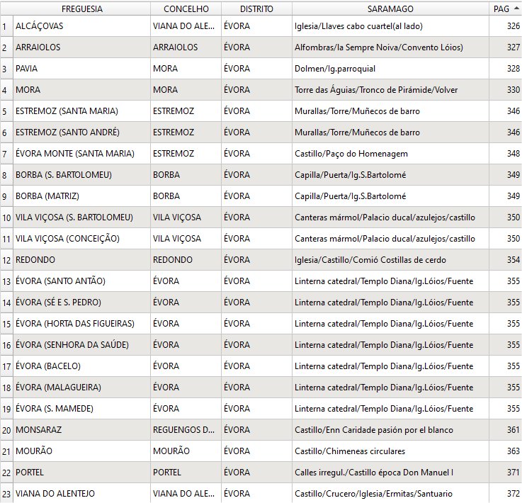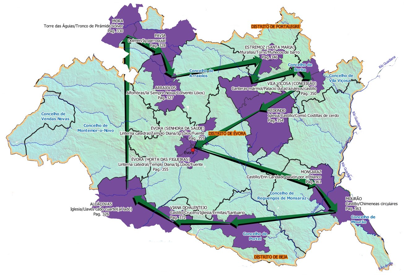 Xa vimos como Saramago visitou en Alcáçovas a igrexa ben gardada á calor do cuartel da garda republicana, asi como a sua visita a Arraiolos terra de artesáns que fabrican alfombras. Parécelle moi fermosa a igrexa de Pavia, con piares de granito octogonales e capiteis con figuras humanas e animais. En Mora visita a Torre dás Águias, arquitectura quinientista coroada por torres cónicas e coa planta en forma de tronco de pirámide ver. En Estremoz visita a parte intramuros da cidade coa Torre dás Três Coroas ver. A cidade esténdese pasando a demarcación das murallas con casas brancas de cal “usando o mármore como pedra común”. Saramago marabíllase dos “bonecos de barro” que “son centenares de figuriñas ordenadas con criterio e gusto ”que marabillan ao visitante» ver. En Évora Monte detense diante do Paço do Homenagem e xa en Borba ver contempla unha fermosa capela “onde a porta ascende ata a cúpula”. Saramago chega a Évora (capital do distrito), cidade histórica ver, onde contempla en primeiro lugar a catedral, que considera “parente das de Lisboa e O Porto”, e visita varios lugares de interese como o Templo de Diana, o museo, a praza Dás Portas de Moura, a igrexa de Lóios “con pedras sepulcrais de rara beleza” ver e A Capela dos Ossos, que “roza a obscenidade” ver.