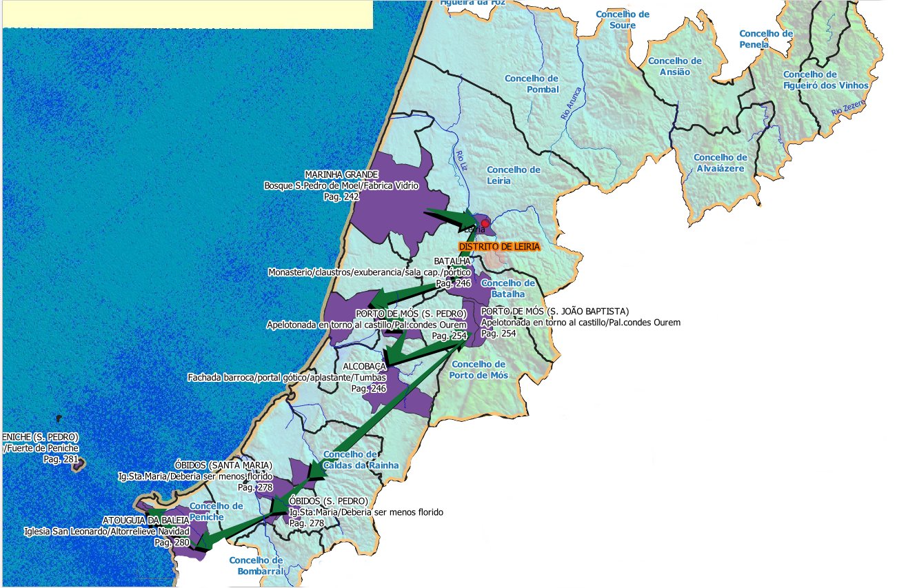 Sorprende ao viaxeiro o castelo de Leiria que “é dos máis amenos lugares de paseo que se poden imaxinar” ver e contempla a cidade desde o magnífico miradoiro do palacio de don Dinis. En Batalha ver sinala “a especie de sentimento de rexeitamento que bruscamente se apoderou de el”, pero compensado polo “claro pracer” que o asolaga o panorama que se contempla desde a entrada á nave principal do seu mosteiro, ou a exuberancia manuelina do claustro real, aínda que o que más lle impresiona é o claustro de Alfonso V. En Alcobaça ver considera o mosteiro coma “un conxunto impoñente, esmagador” e encomia as “marabillas de escultura” das tumbas de don Pedro e dona Inés. O viaxeiro considera que Óbidos ver “debería ser menos florido” aínda que está seguro de que “merecen todas as demais encomios” a igrexa de Santa María, o museo, a igrexa da Misericordia ou o camiño de ronda do castelo). En Peniche ver visita o seu forte e contempla de lonxe as illas Berlangas desde o cabo Carvoeiro.
