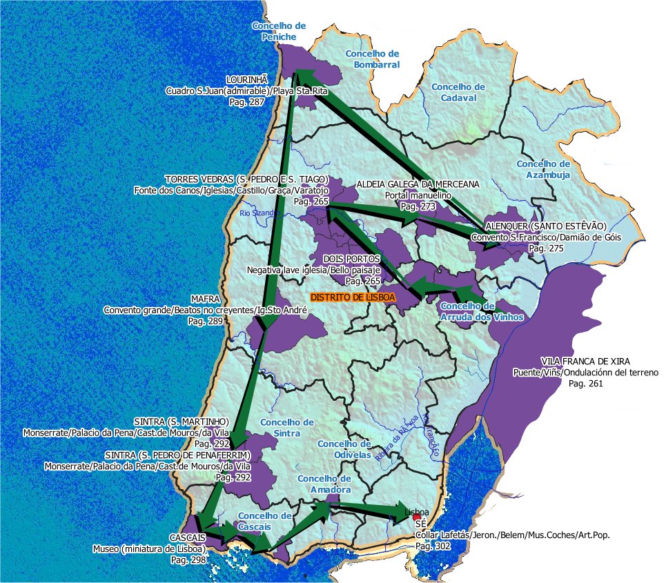 O viaxeiro entra agora na terra lisboeta, moi poboada, “onde as aldeas tócanse”, con moitas viñas e constante ondulación do terreo. Comeza en Vila Franca de Xira, coa súa ponte torcida pero servicial ver. São Quintino coa súa bonita igrexa “unha xoia preciosa e case ignorada” ver, Torres Vedras (capital do concello) coas súas igrexas, o convento da Graça e o museo municipal, Turcifal coa súa altísima igrexa, Varatojo ver co claustro sinxelo “dos que ao viaxeiro gústanlle” e o portal manuelino do seu convento franciscano. Continua por Aldeia Galega co magnífico portal manuelino ver e por Alenquer onde naceu o humanista Damião de Góis. Xa en Sintra ver visita o palacio orientalizante de Monserrate que lle entristece porque ten todos os gustos dunha época pero ningún definido; o Palacio da Pena, que cualifica de “fantasía, inconsciencia, mal gusto, improvisación…”; o Castelo de Mouros, para ver de lonxe; a pobreza e humildade do Convento dous Capuchinos e o Palacio Nacional dá Vila onde foron deixando restos os gobernantes portugueses. Finaliza esta etapa “ás portas” de Lisboa visitando en Cascais o Museo de Castro Guimarães ver; en Carcavelos as magníficas decoracións de azulexos da igrexa ver; Estoril coa superficie florida que se estende desde o casino ata a praia e o palacio de Queluz ver coa arte decorativa superficiaa.