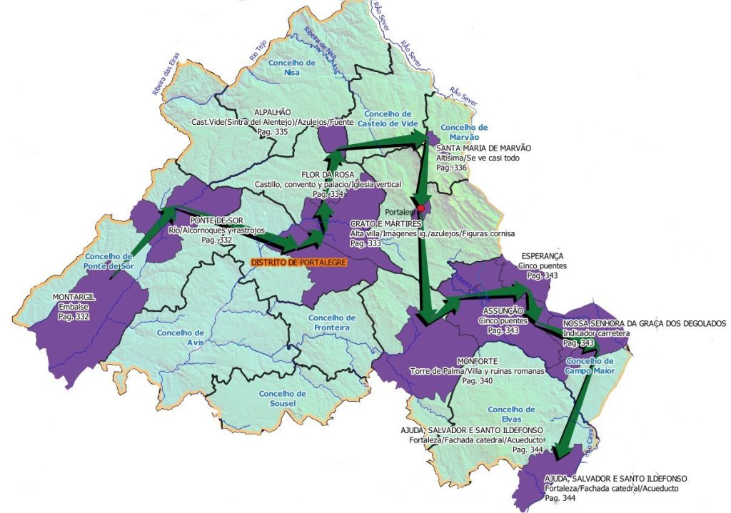 Desde Mora diríxese o viaxeiro a Montargil, situada ao longo do encoro do mesmo nome. Continua entre paisaxes de sobreiras e restrollos ata chegar a Ponche de Sôr e Alter do Chão coa súa fonte renacentista, o seu flamante castelo e a ben conservada ponte romana ver. Segue Saramago ata Crato e detense diante da igrexa parroquial, con boas imaxes e azulexos. Moi preto atópase o viaxeiro con Flor de Rosa co seu castelo e unha igrexa dunha altura inesperada. En Alpalhão, coñecida como a «Sintra do Alentejo» o viaxeiro visitou a igrexa de Santo Iago, revestida de azulexos, cunha fonte monumental e un ben conservado barrio da xudería. Chega a Marvão ver, sube á torre da homenaxe do castelo desde “a que se ve todo”, incluídas as terras españolas Valencia de Alcántara, San Vicente de Alcántara e Alburquerque. Xa en Portalegre ver introdúcese na cidade vella e desde a praza da catedral disfruta dunha bonita perspectiva do templo. En Monforte visita unha cooperativa agrícola e os restos da vila romana de Torre de Palma. Entre descampados atravesa algúns pobos ata chegar a Elvas ver cos seus fortes monumentais e a bonita fachada da catedral.