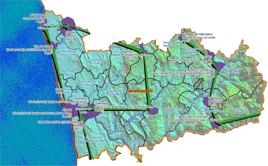 Comenza a visita en Matosinhos onde admira a disposición da igrexa do Senhor Bom Jesus (ver), obra perfecta do arquitecto italiano Nasoni, toda en horizontal. En Vila do Conde contempla a picota cun brazo armado de espada ver, símbolo da xustiza señorial. En São Cristovão do Rio Mau encomia a sinxeleza de igrexa pero que chega á sensibilidade estética do viaxeiro ver. Os capiteis da igrexa de Rates (ver) considéraos “obras mestras da estatuaria, que toda a fachada, cos seus contrafuerte, afaga os ollos e o espírito”. Alén do Douro, nas adegas de Vilanova de Gaia, “desaguan os grandes afluentes das uvas esmagadas e do mosto”. O viaxeiro ainda tuvo tempo de visitar a pequena poboación de Trofa, un dos principais «momentos» do seu percorrido onde se atopa a capela dos Lemos ver..