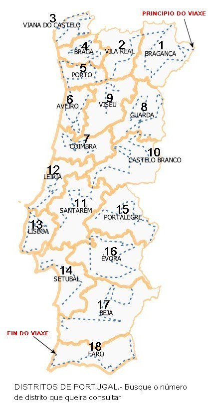 Por consideralo así conveniente para non perderse na complexidade do percorrido, dividín o contido desta páxina web en capítulos numerados do 1 ao 18, correspondentes cada un deles aos distritos en que está dividido o Portugal peninsular. Cada distrito contén un pequeno comentario escrito en galego e un mapa do distrito feito por min onde se sinalan os concellos e, marcado con unha frecha, a secuencia do percorrido. Finalmente, incluese tamén unha táboa onde se indica o concello e o distrito ao que pertenece cada poboación xunto con outros elementos como os monumentos máis destacados de cada unha delas .