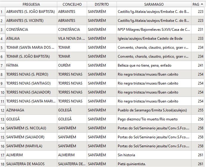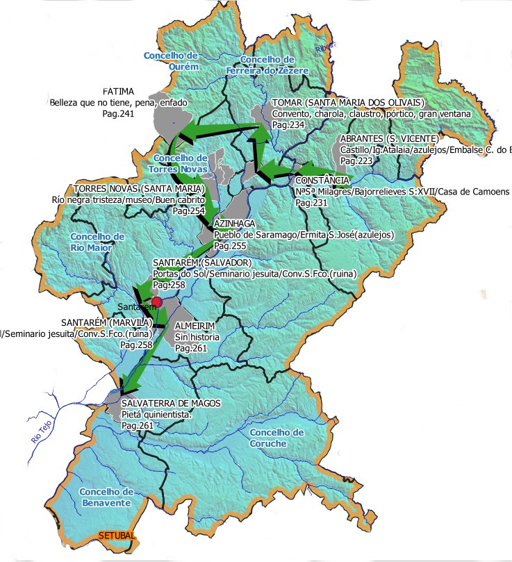 Desde Sertá (Castelo Branco), o viaxeiro chega a Abrantes (distrito de Santarém), considerada xa por Saramago como “terras do sur”. De alí chega a Tomar, onde destaca o seu convento “o convento de Tomar é o pórtico, é o coro manuelino, é a charola, é a gran xanela, é o claustro…” ver. Saramago considera o palacio de Ourém como unha obra de xigantes ver. En cambio pensa que sobre o santuario de Fátima “só a fe podria salvar a Fátima da beleza que non ten” ver. En Torres Novas foi a ver o río e produciulle “negra tristeza”. Pasa por Azinhaga, o seu lugar de nacemento e visita a ermida de San José cos seus “bellísimos azulexos” ata chegar finalmente á “cidade singular” de Santarém onde visita a Porta do Sol e as suas espléndidas igrexas pero que lle “dá sempre a mesma sensación de estar pechada” ver.