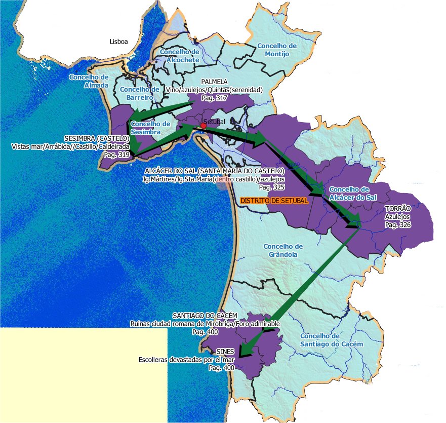 No distrito de Setúbal o seu primeiro destino é Palmela. Desde a torre do homenaxe do seu castelo “dan os ollos a volta ao mundo” ver. Descende cara a Sesimbra e encomia as “caldeiradas” que se comen por toda esta costa. Xa en Setúbal, considera a igrexa de Jesús “o máis belo monumento da cidade” a pesar de que a fachada harmoniosa “non deixa prever as artificiosas columnas torsas que sustentan as bóvedas”. Os paneis de azulexos “constitúen un conxunto de excepcional importancia” ver. O viaxeiro decide ir a Alcácer do Sal, xa na ardente terra do Alentejo, onde o río Sado empeza a gañar forza para a súa saída ao mar. En Torrão ver contempla os muros de azulexos do templo parroquial, e en Alcáçovas visita a igrexa ben gardada á calor do cuartel da garda republicana. O castelo de Montemor-o-Novo de lonxe parece unha sólida construción pero non hai máis que ruínas ver. Arraiolos terra de artesáns que fabrican alfombras. Parécelle moi fermosa a igrexa de Pavia, con piares de granito octogonales e capiteis con figuras humanas e animais. En Mora visita a Torre dás Águias, arquitectura quinientista coroada por torres cónicas e coa planta en forma de tronco de pirámide ver.